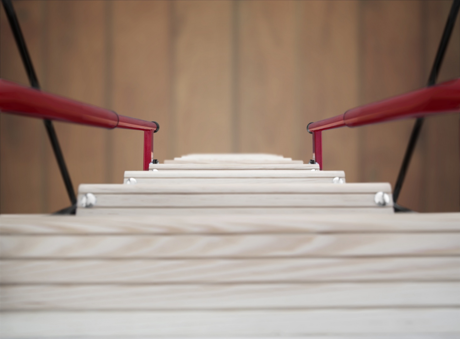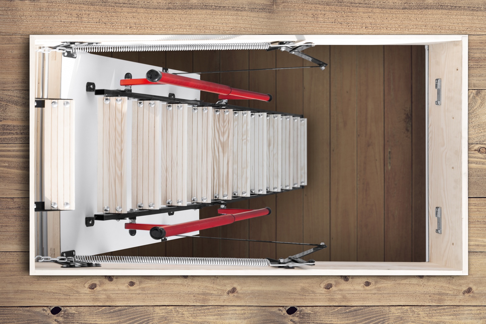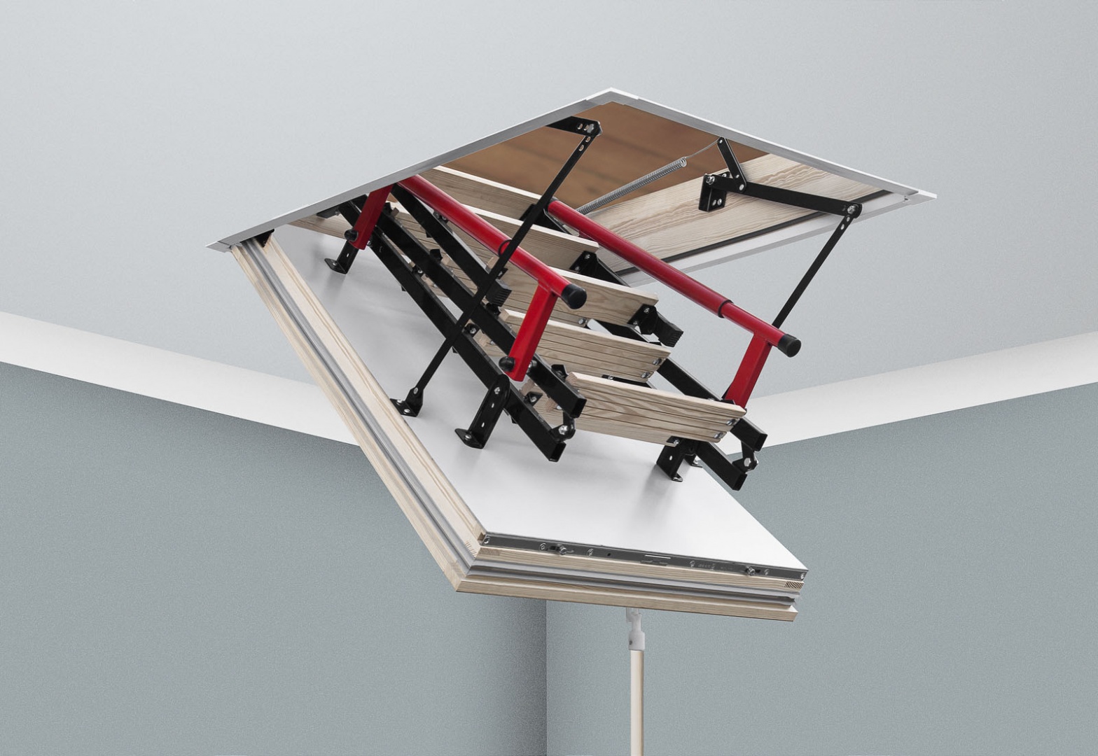Speciální system pružinového mechanism v madle odlehčuje žebřík v průběhu otevření. Díky tomuto otvírání schodů je jednoduché a bezpečné.