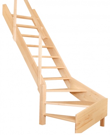 Schody z zabiegiem prawym lub lewym wykonane z drewna iglastego. Poręcz w zestawie. Łatwe w montażu. Po montażu gotowe do polakierowania lub pomalowania. Grubość policzków i stopni wynosi 3,2 cm.