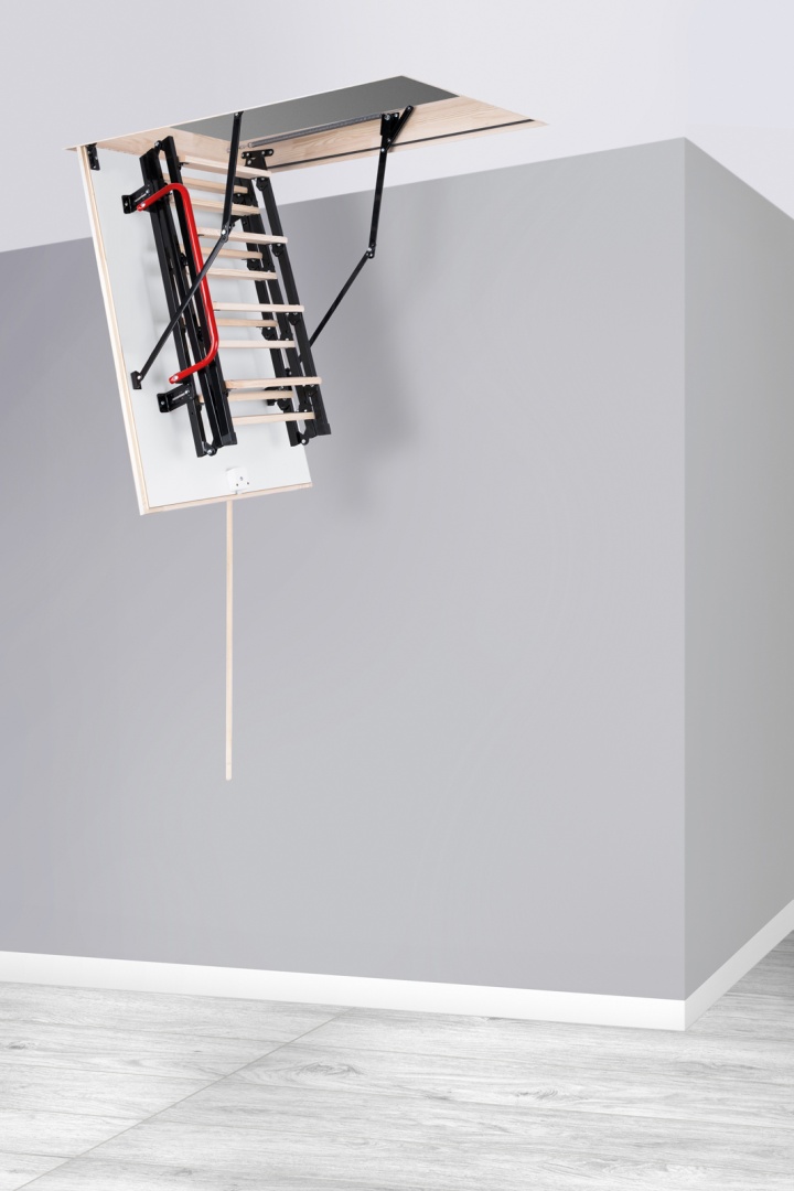 Schody strychowe STALLUX TERMO z drabinką metalowo-drewnianą o współczynniku przenikania ciepła klapy 1,22 W/m2*K oraz klapie o grubości 26mm.